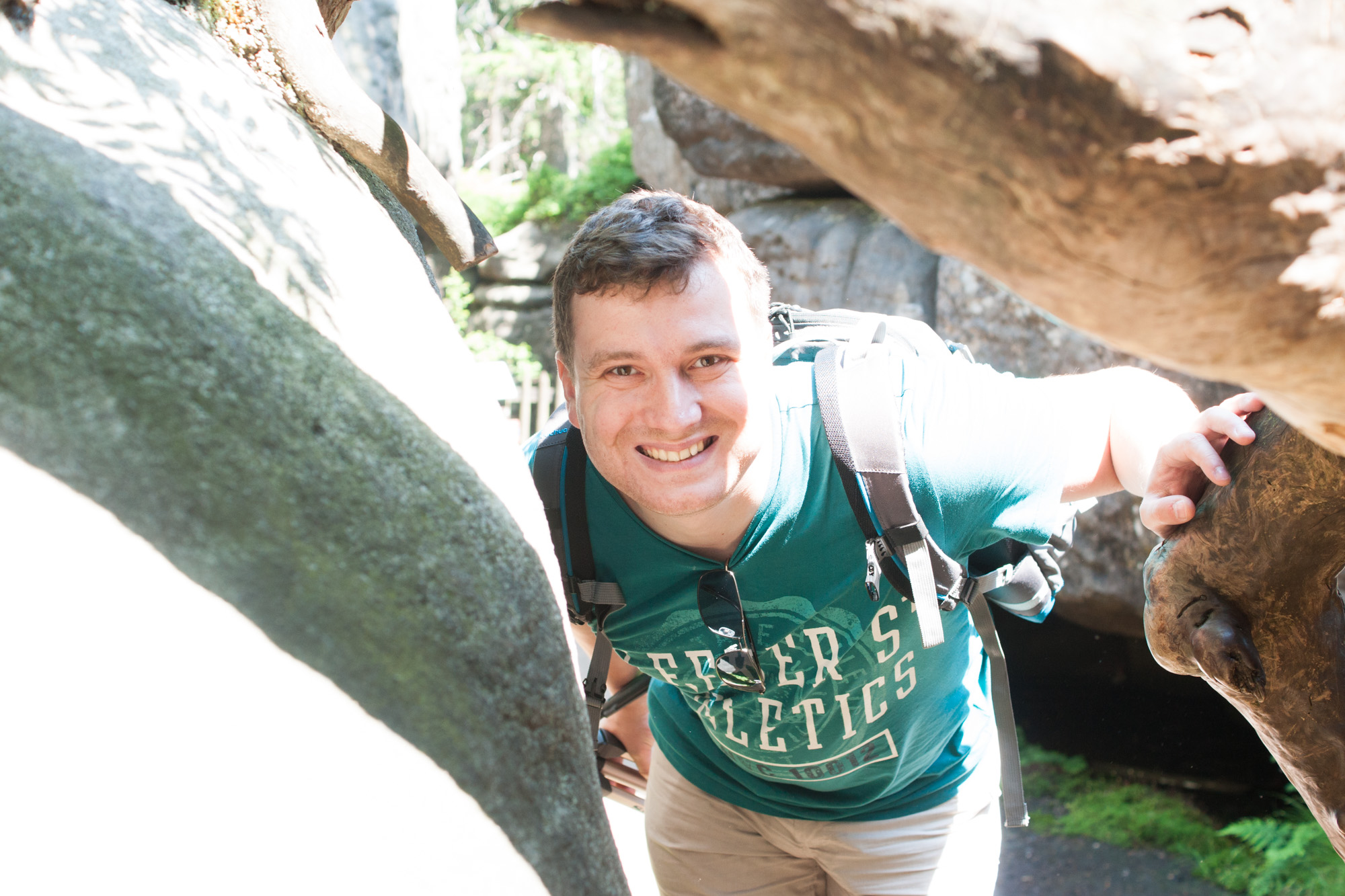 Chcieliśmy trochę pochodzić po górach, ale z racji upałów i mojego rosnącego brzuszka, wybraliśmy łagodną trasę. Wybraliśmy się w Błędne Skały i z czystym sumieniem polecam każdemu, kto szuka alternatywy dla spędzania upałów nad wodą. W mieście temperatura nie do wytrzymania, a tam – w labiryncie między skałami – prawdziwy relaks.  W pewnym momencie aż stwierdziliśmy, że jest dość chłodno, pomimo tego, że słońce mocno grzało. Spacerek łatwy i bardzo przyjemny, zdecydowanie polecam wszystkim mniej aktywnym turystom, a także rodzinom z dziećmi. Choć przyznam, że było kilka miejsc, w których przeciskanie się z dość pokaźnym już brzuszkiem było chwilami odrobinkę kłopotliwe.