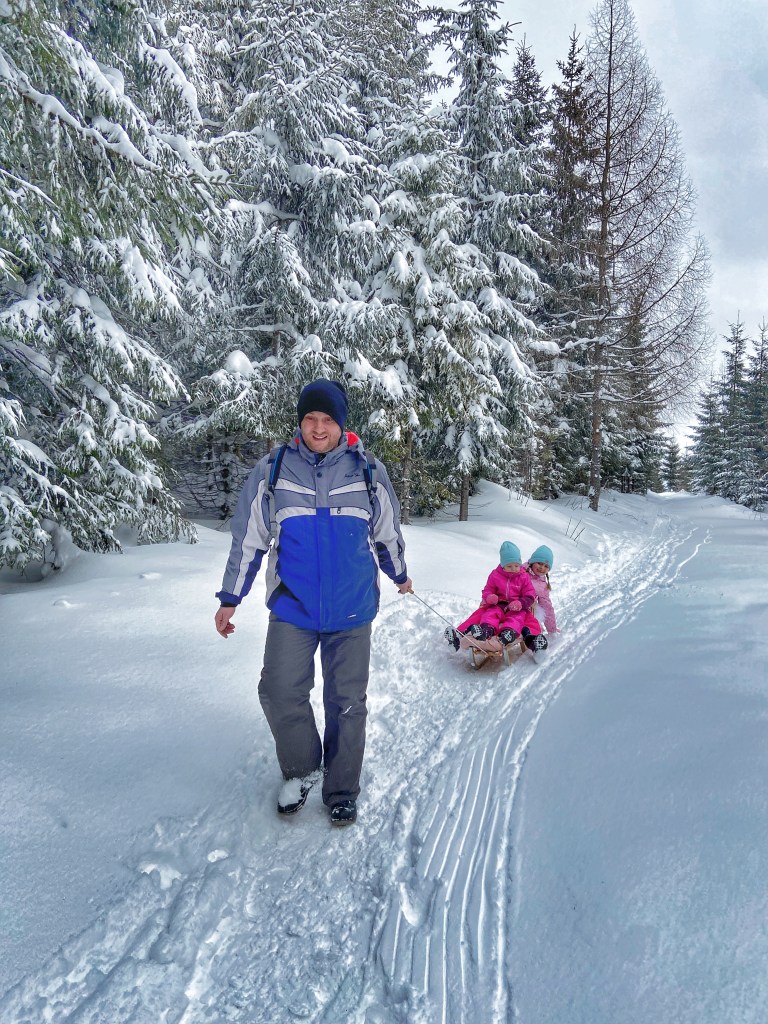 Wracamy w doskonałych nastrojach. Nic dziwnego: dziewczynki większą część trasy pokonują zjeżdżając z tatusiem na sankach. Tylko ja dzielnie biegnę niemalże za nimi. Ale spokojnie, odbiję to sobie w trakcie kolejnej wycieczki. 🙂