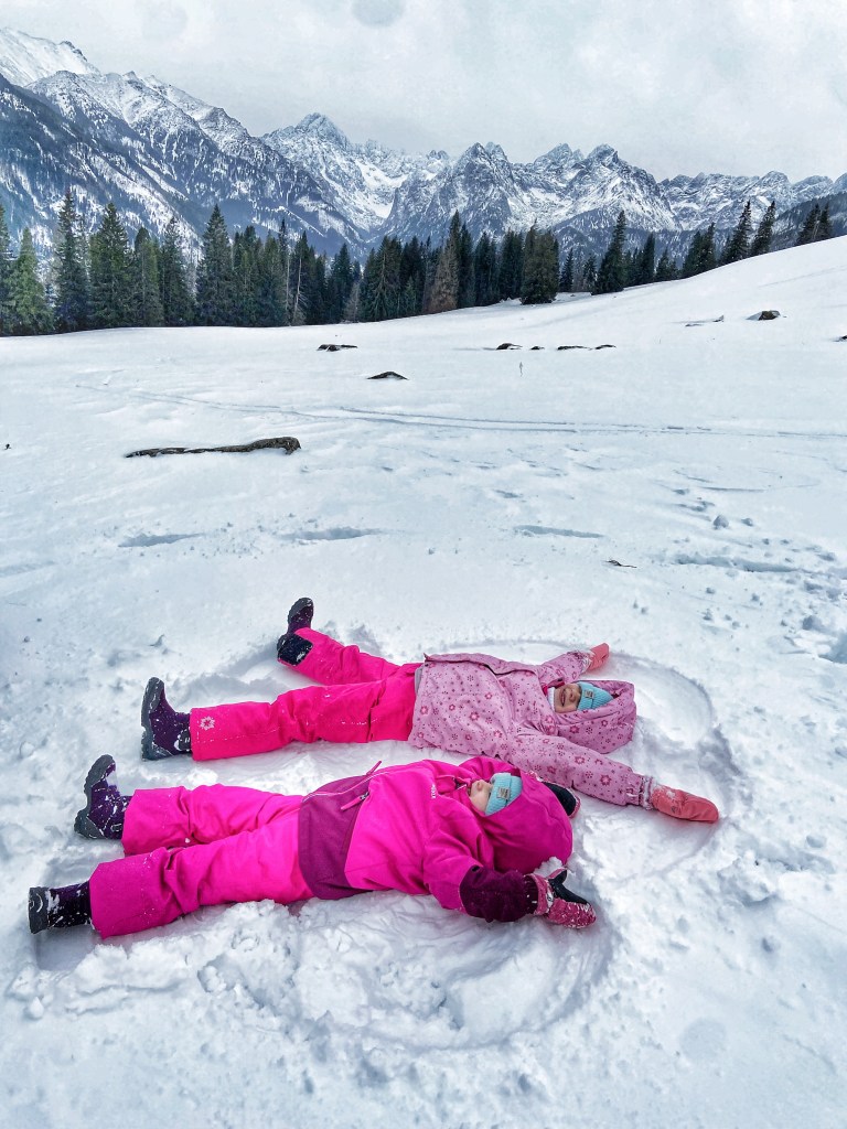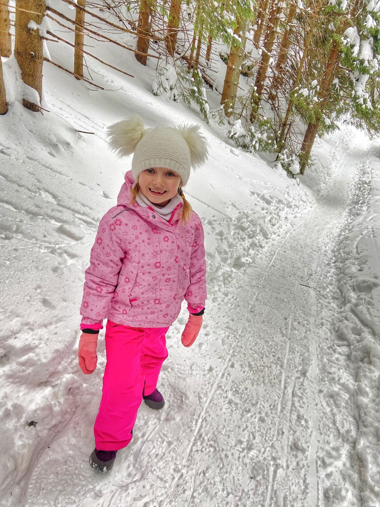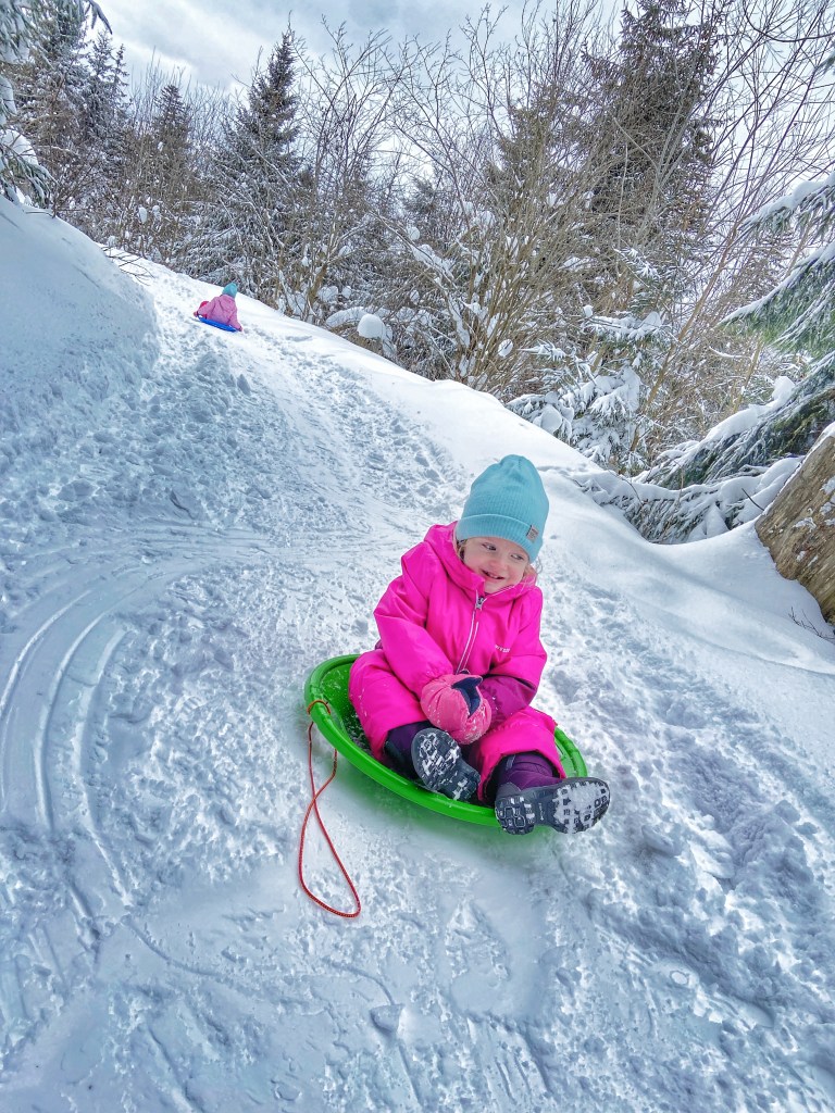 Drogę powrotną pokonujemy tym samym szlakiem: połowę trasy niosąc sanki pod pachą i brodząc po kolana w śniegu, a drugą połowę ciągnąc dziewczynki na sankach lub – ku ich ogromnej uciesze – zjeżdżając na ślizgach. Ludzi nadal niewiele, więc wszelkie szaleństwa zjazdowe dozwolone! To był naprawdę cudowny dzień!