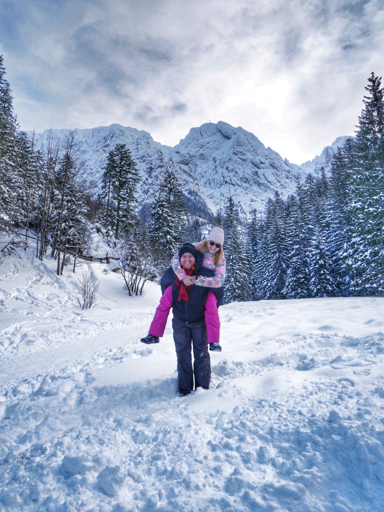 Mniej więcej w połowie drogi (po około pół godziny marszu) wychodzimy z lasu i raz po raz naszym oczom zaczynają się ukazywać majestatyczne góry. I tu zaczyna być problem z sankami, bowiem śniegu jest na tyle dużo, że brodzimy w nim po kolana (Klaritka po uda praktycznie), a śnieg jest świeży i nieubity, nie ma więc najmniejszej możliwości aby przejechać tędy sankami. Połowę drogi pokonujemy więc niosąc je pod pachą i żałując, że zabraliśmy je ze sobą. 😉