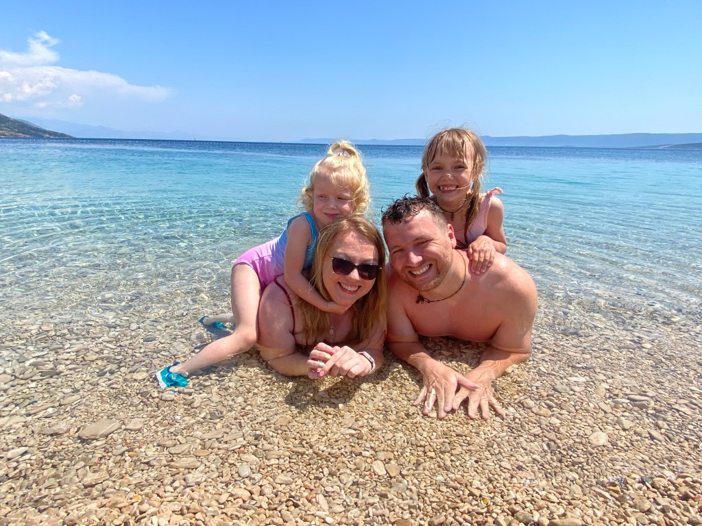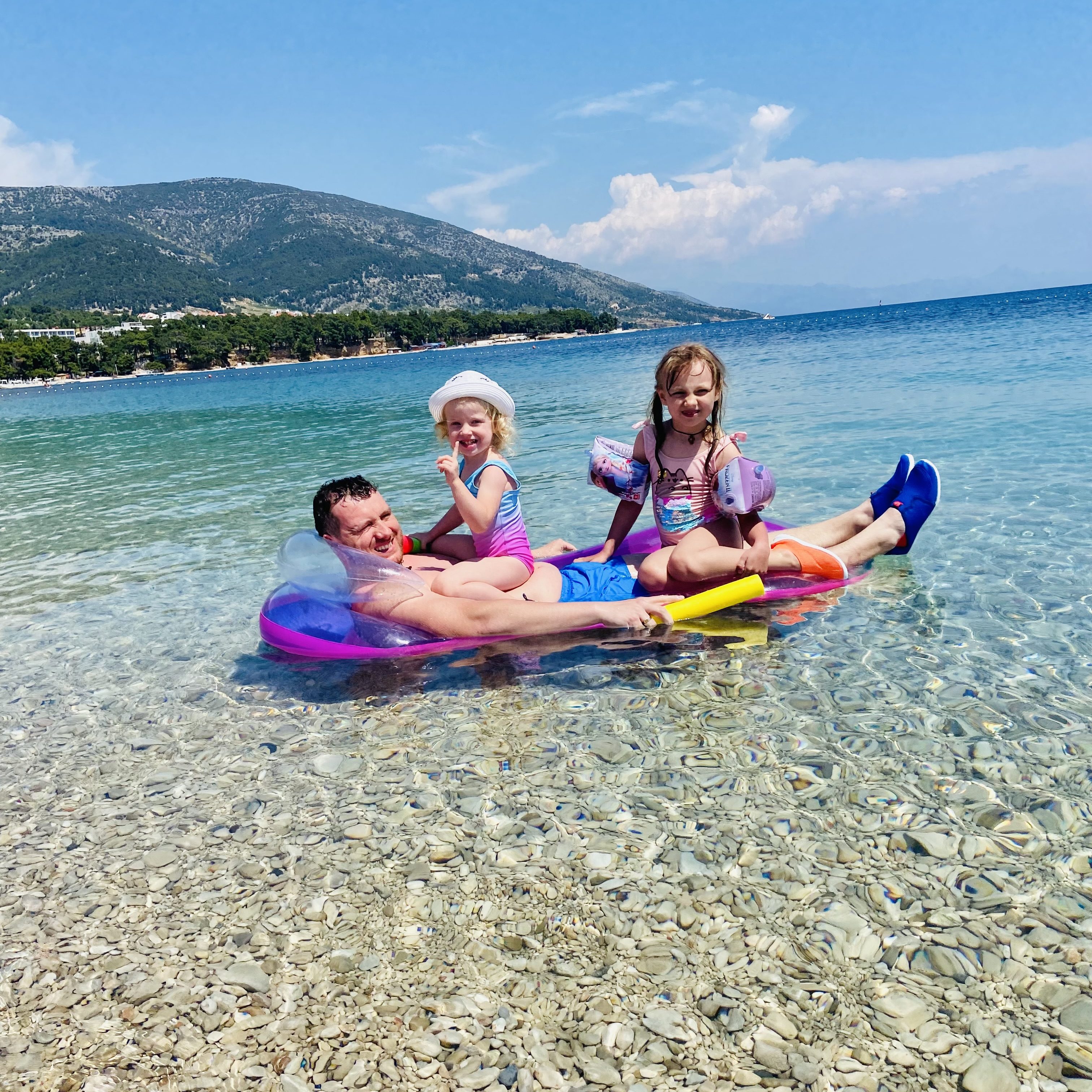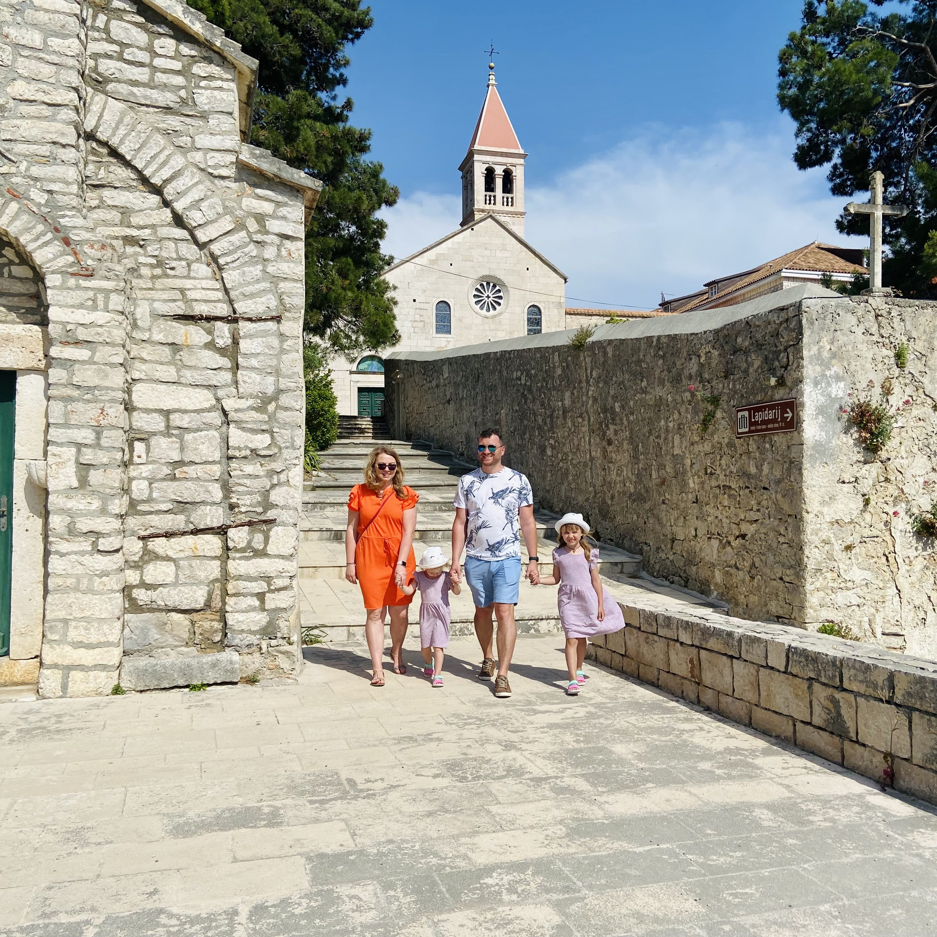 Docieramy do miasta Bol: chcemy pokazać dziewczynkom słynny Złoty Róg i poplażować w dość odmiennych warunkach niż na Rivierze Makarskiej (plaża na Złotym Rogu opisywana jest często jako piaszczysta – w rzeczywistości jest to bardzo drobny żwirek w jasnym, niemalże białym kolorze). Zostawiamy samochód na parkingu (tutaj), za który płacimy 50 kun/3 godziny i drogą wiodącą przez las po około 10 minutach dochodzimy na plażę. Tu już przez najbliższe godziny oddajemy się słodkiemu lenistwu na leżaku (leżak 70 kun, parasol 70 kun), lub zabawom w wodzie i tak przyjemnie mija nam czas, aż w końcu z ogromnym smutkiem opuszczamy to miejsce. Jedziemy do portu, spacerujemy wzdłuż wybrzeża, następnie planujemy zwiedzić Klasztor Dominikanów (tutaj) , ale ku naszemu rozczarowaniu okazuje się zamknięty. Spędzamy zatem trochę czasu na urokliwej plaży za klasztorem, po czym wyruszamy w drogę powrotną do Sumartinu. Tu już tylko spacer po miasteczku, wspólne lody i plac zabaw i zanim się obejrzeliśmy trzeba było wracać na prom. Opuszczamy więc Brać z wdzięcznością za ten dzień, ale i ogromnym niedosytem, a gdzieś tam w środku kiełkuje w nas myśl czy może następnym razem nie zatrzymać się tu na kilka dni? Czas pokaże.