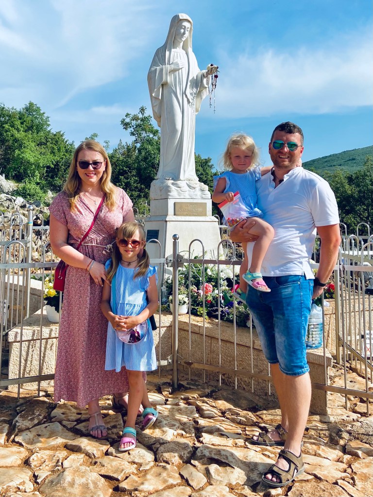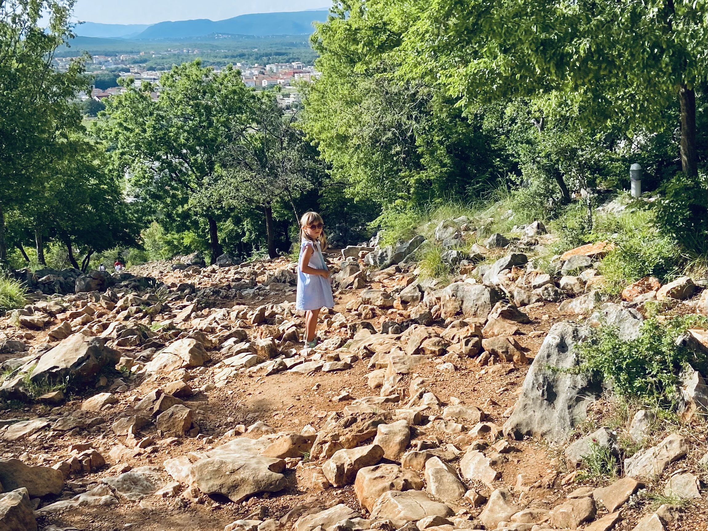 Po obiedzie wsiadamy w samochód i jedziemy do Bijakovici. Jest to niewielka mieścina przez wielu uważana za część Medjugorie, obecnie włączona do parafii św. Jakuba. Tam parkujemy na jednej z pobocznych uliczek i ruszamy w drogę na Górę Objawień (Brdo Ukazanja). Droga na górę prowadzi po dość stromych kamieniach, a pogoda nie ułatwia nam pielgrzymowania. Na szczęście już na początku wspinaczki dostrzegamy płaskorzeźby z brązu przedstawiające radosne części różańca: od razu więc chwytamy nasze różańce w dłonie i rozpoczynamy rodzinną modlitwę. Idziemy z modlitwą na ustach, z intencjami w sercu i tymi wypowiedzianymi na głos. Klarci nóżki odmawiają posłuszeństwa, więc Krystek bierze ją na ręce i aż do końca wędrówki ją niesie. Sarcia dzielnie podąża na przód z uśmiechem i modlitwą na ustach.