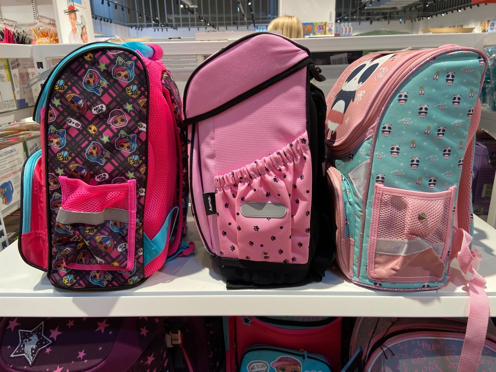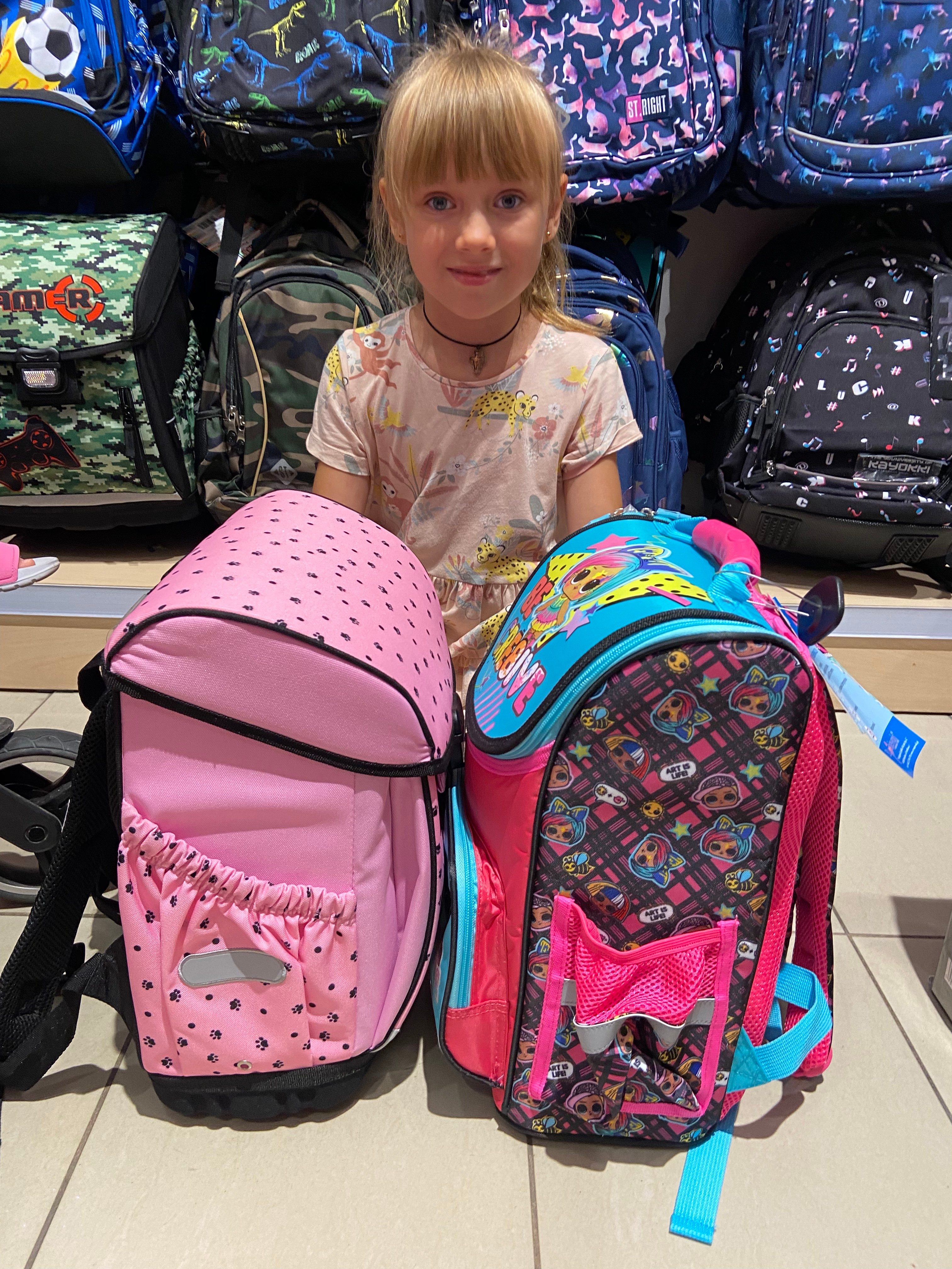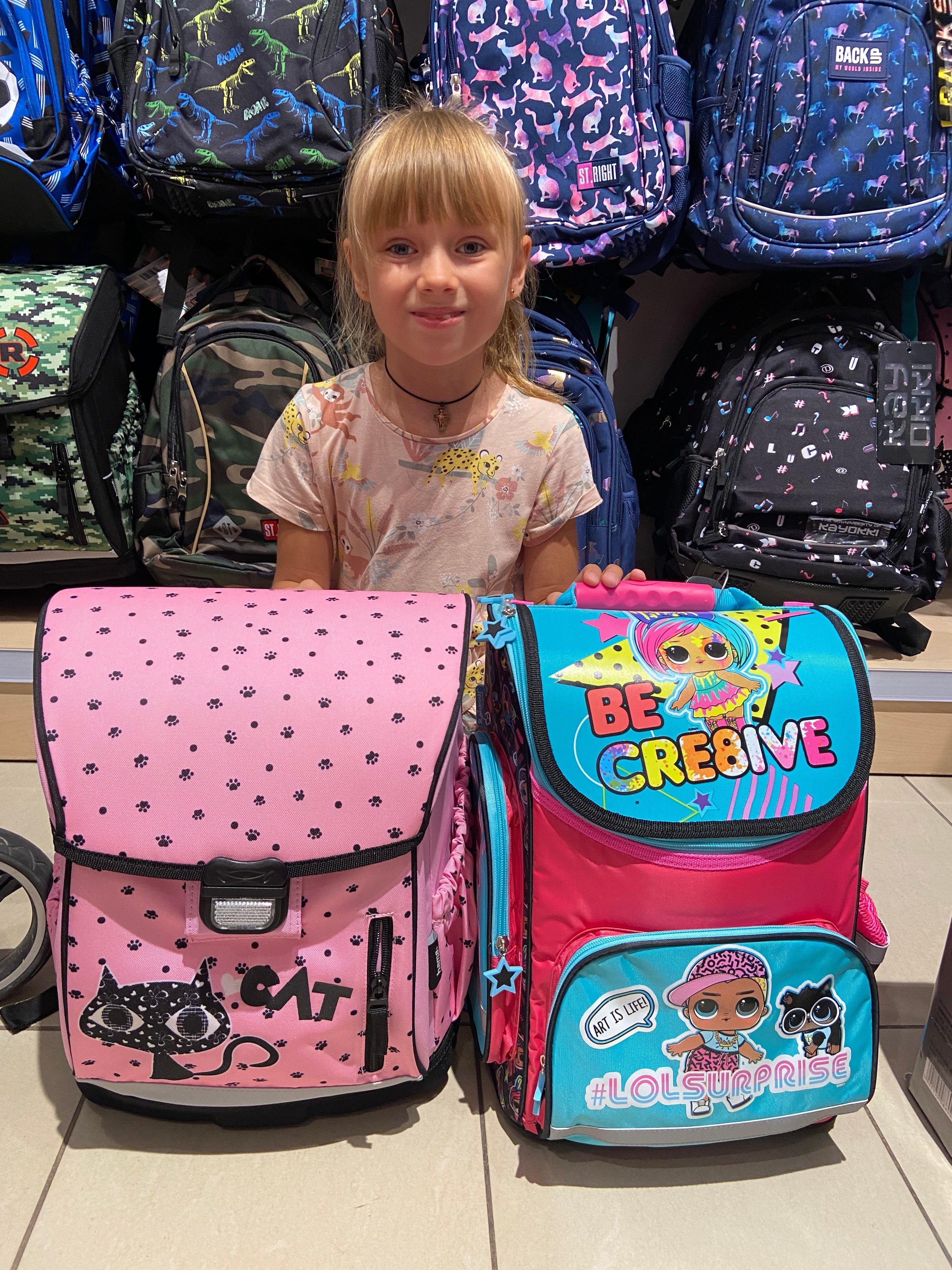 Pierwsze tornistry, jakie testowałyśmy: różowy Hama, z laleczkami LOL Majewski. Hama zdecydowanie większy i bardziej toporny. Dla Sarci za duży. Hama u nas z pewnością odpada.
