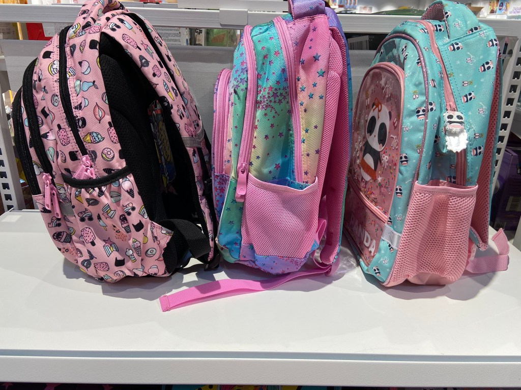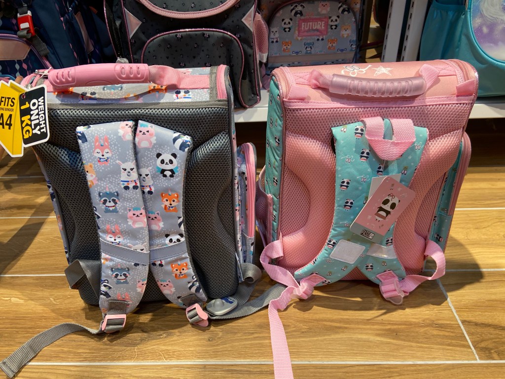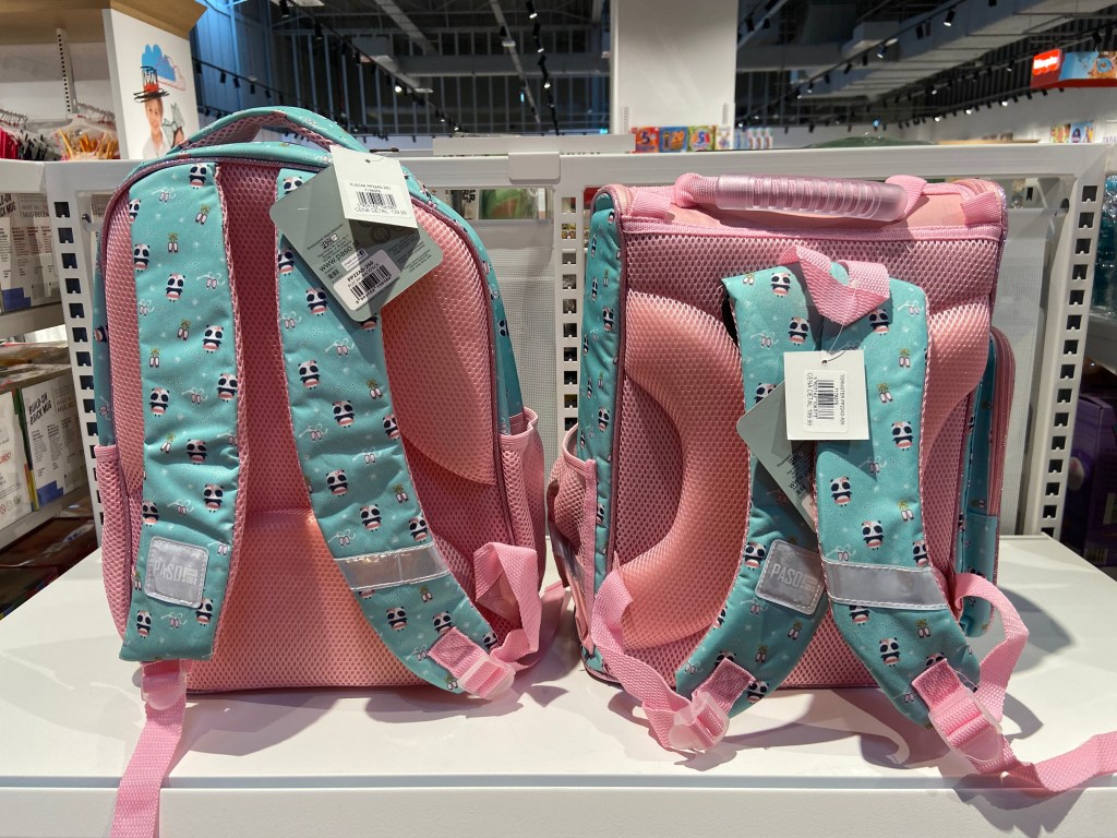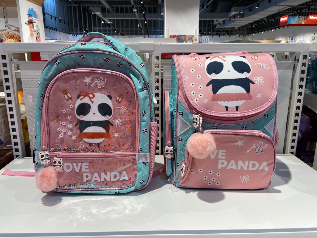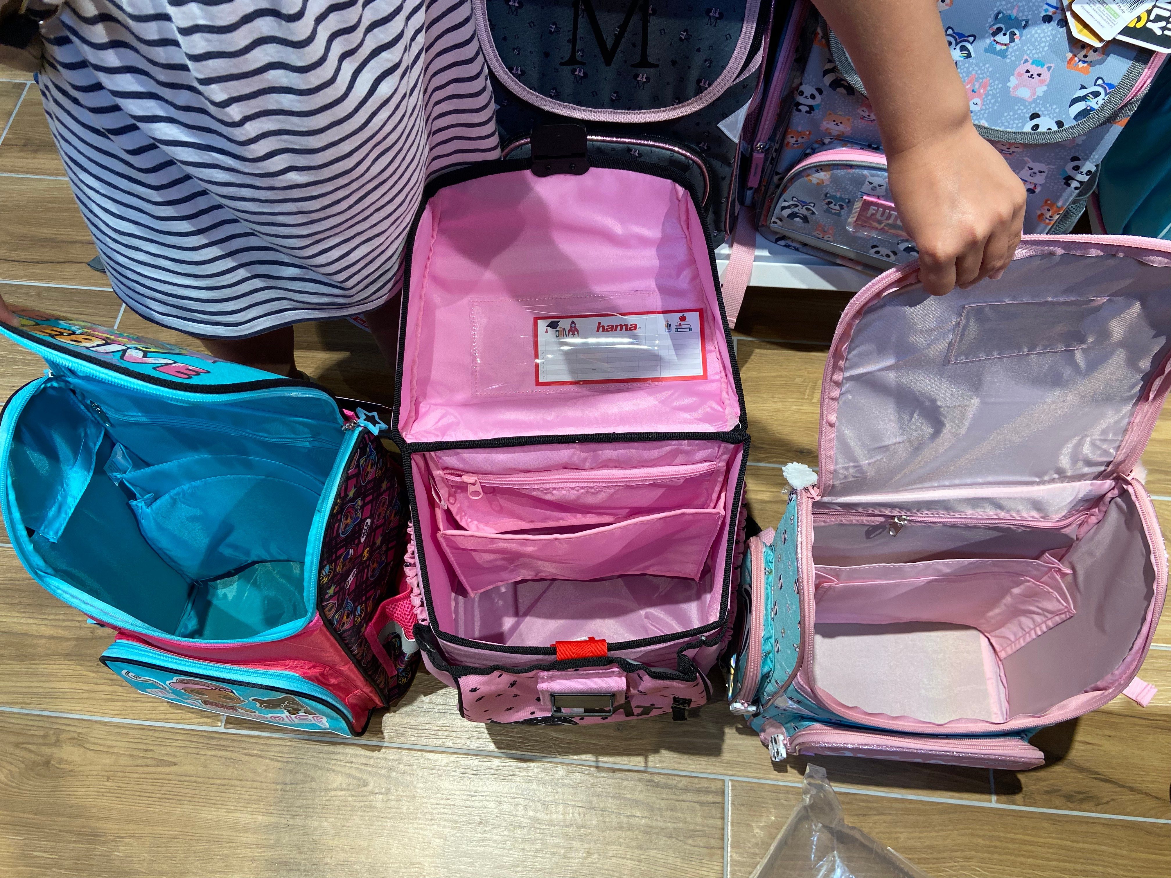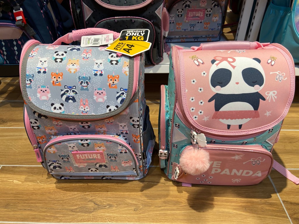 W kolejnym sklepie porównywałyśmy jeszcze inną kombinację: od lewej Majewski (LOL), Hama (kot), Paso (Panda). Hama odrzucamy już na wstępie z uwagi na rozmiary, tym razem odrzucamy też firmę Majewski: tornister ten wydaje się być odrobinę większe od Paso, ponadto wnętrze Paso wygląda bardziej estetycznie. Póki co naszym faworytem jest Paso.