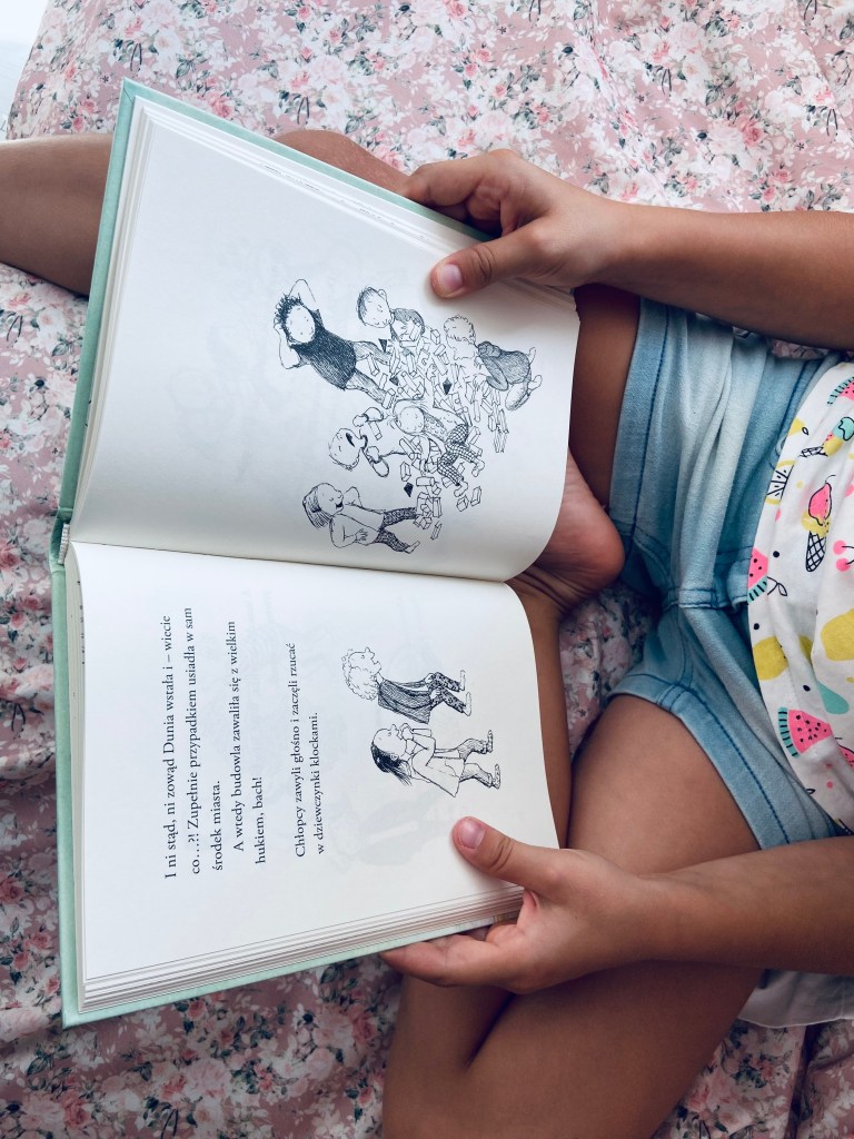 Zdecydowanie ulubiona, najpiękniejsza i najukochańsza książka naszej córki. Przeczytała ją samodzielnie i od razu zapragnęła drugiej części. Być może dlatego, że nasza Sarka bardzo zidentyfikowała się z główną bohaterką, Dunią? Bo Dunia, tak jak Sarka idzie do pierwszej klasy. I z podekscytowania nie może zasnąć! Nie zna z nowej klasy nikogo, ani dzieci, ani pani i trochę się obawia, czy uda jej się tam odnaleźć. Dunia nawet nie przypuszcza, że w szkolnej ławce pozna przyjaciółkę od serca, z którą każdy dzień będzie po prostu wielką przygodą, ale i wielką troską. I właśnie o tym jest ta ciepła, wciągająca opowieść. Mały czytelnik polubi przygody Duni także z tego powodu, że lektura jest bardzo przyjemna, czcionka dość spora, dużo ilustracji do tekstu, a zdania proste i dostosowane do możliwości początkującego ucznia. To taki must have dla każdej dziewczynki (i pewnie niejednego chłopca!) w wieku 6-7 lat.
