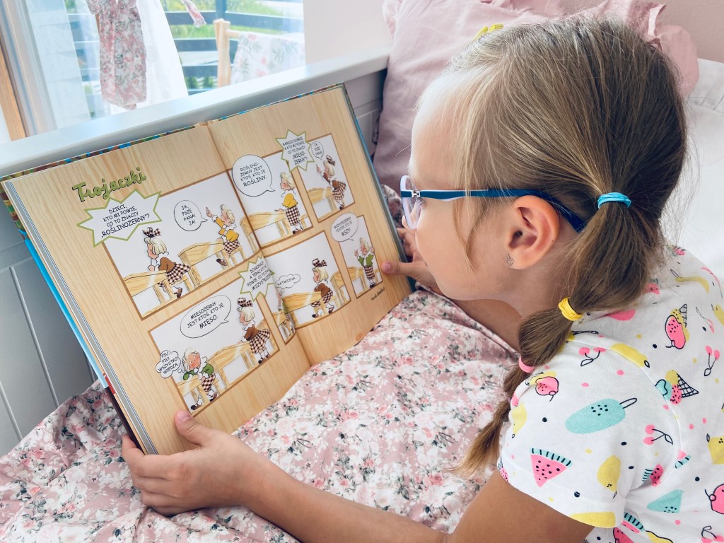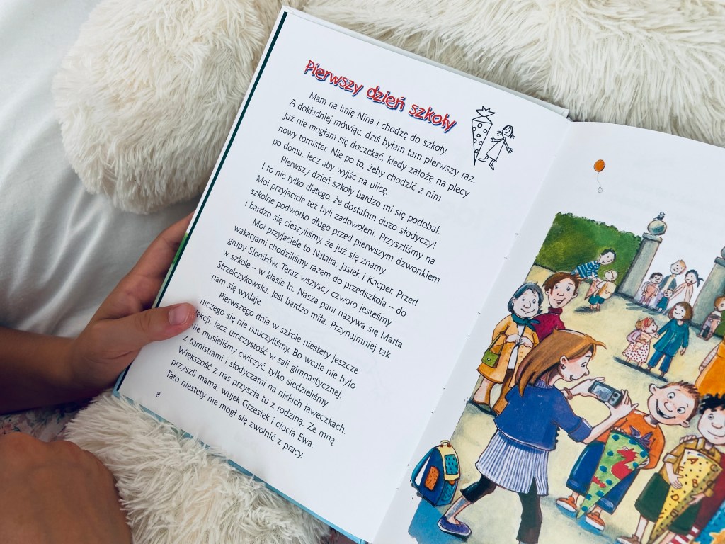 Kolejna pozycja do samodzielnego przeczytania: duże litery, proste zdania, mnóstwo kolorowych ilustracji. Sarka żałowała tylko, że książka nie jest podzielona na rozdziały: w ten sposób zdecydowanie łatwiej jej się czyta, ale to bardzo subiektywna ocena, bo pozycja nie jest moim zdaniem na tyle gruba, żeby wymagała takiego usystematyzowania. Niemniej jednak dla mojej córki to ważne. Sama historia z pierwszym dniem w szkole niewiele ma wspólnego: to opowieść „z dreszczykiem” o tym, że w szkole, do której idą Julia i Oliwka straszy duch! Już jutro rozpoczęcie roku, a dziewczynki po tym co widziały za nic w świecie nie zamierzają przekroczyć progu szkoły. Kim okaże się tajemniczy duch? Warto się o tym przekonać!